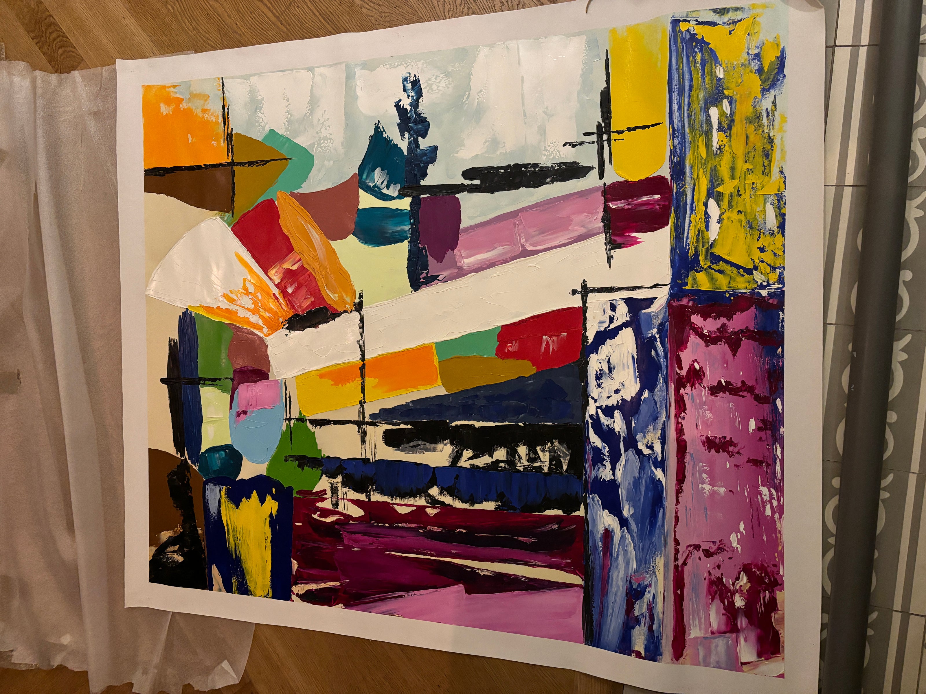 ''The painting reached us in excellent condition. It was well packaged and well protected for shipping. It meets our expectations with a good quality canvas and an abstract representation that highlights the play of colors chosen. Kudos to the artist!''