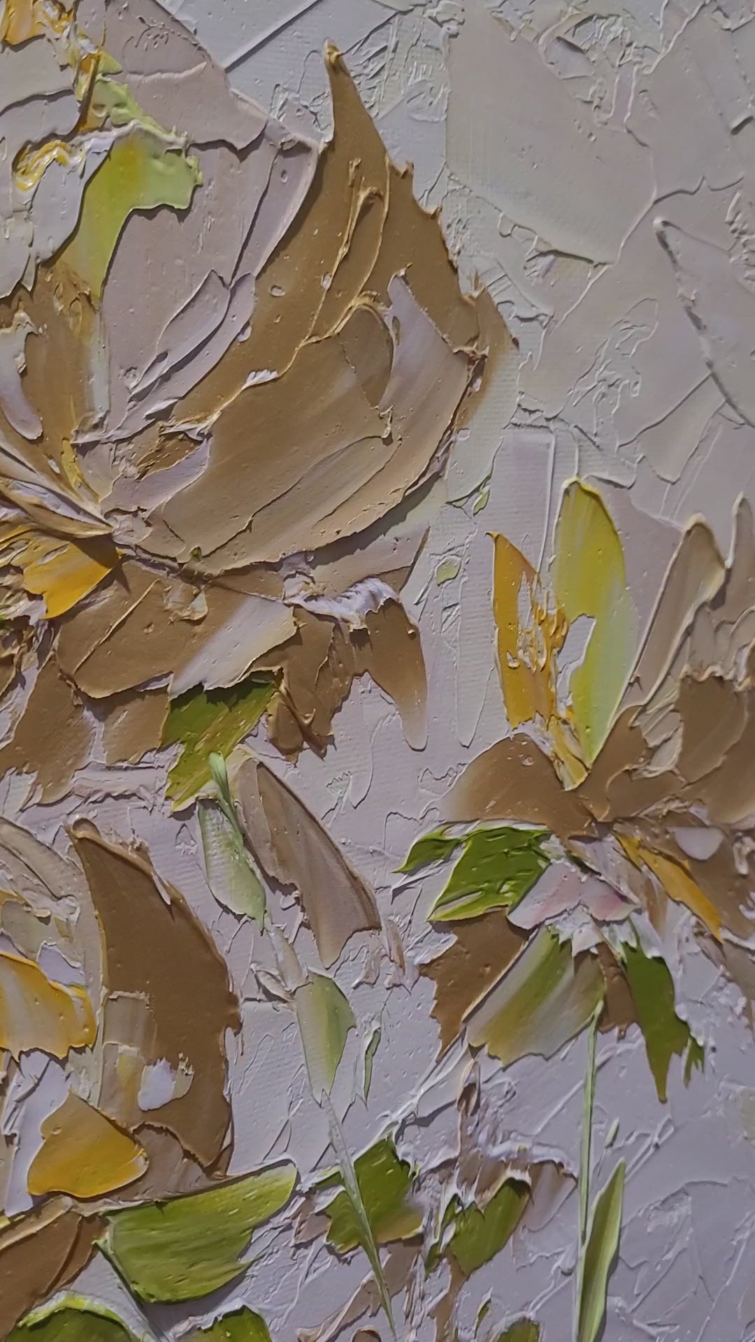 - This stunning impasto textured floral oil painting on canvas captures the delicate beauty of blooming flowers with vibrant gold colors and thick, expressive brushstrokes.