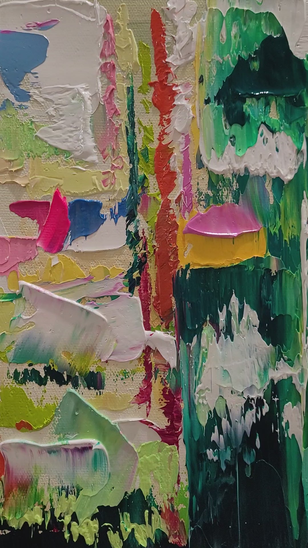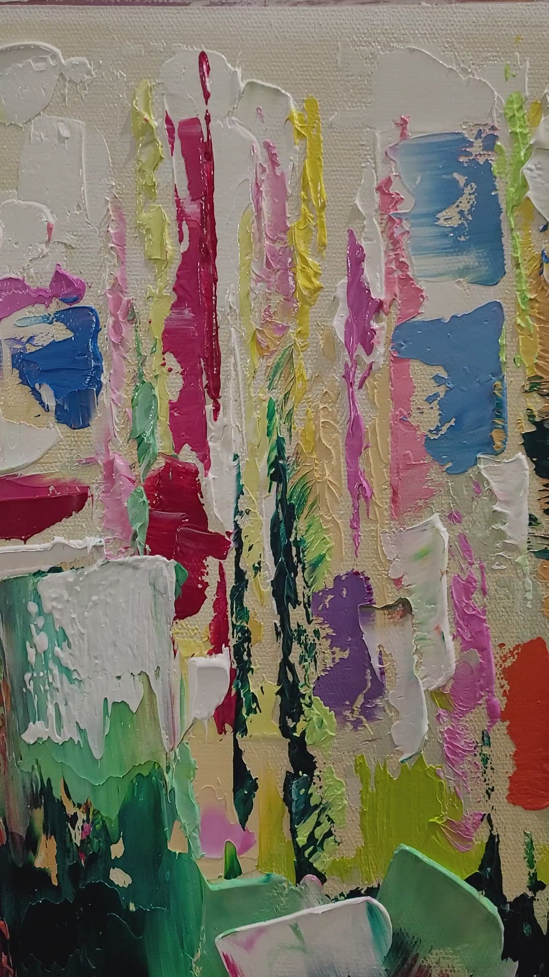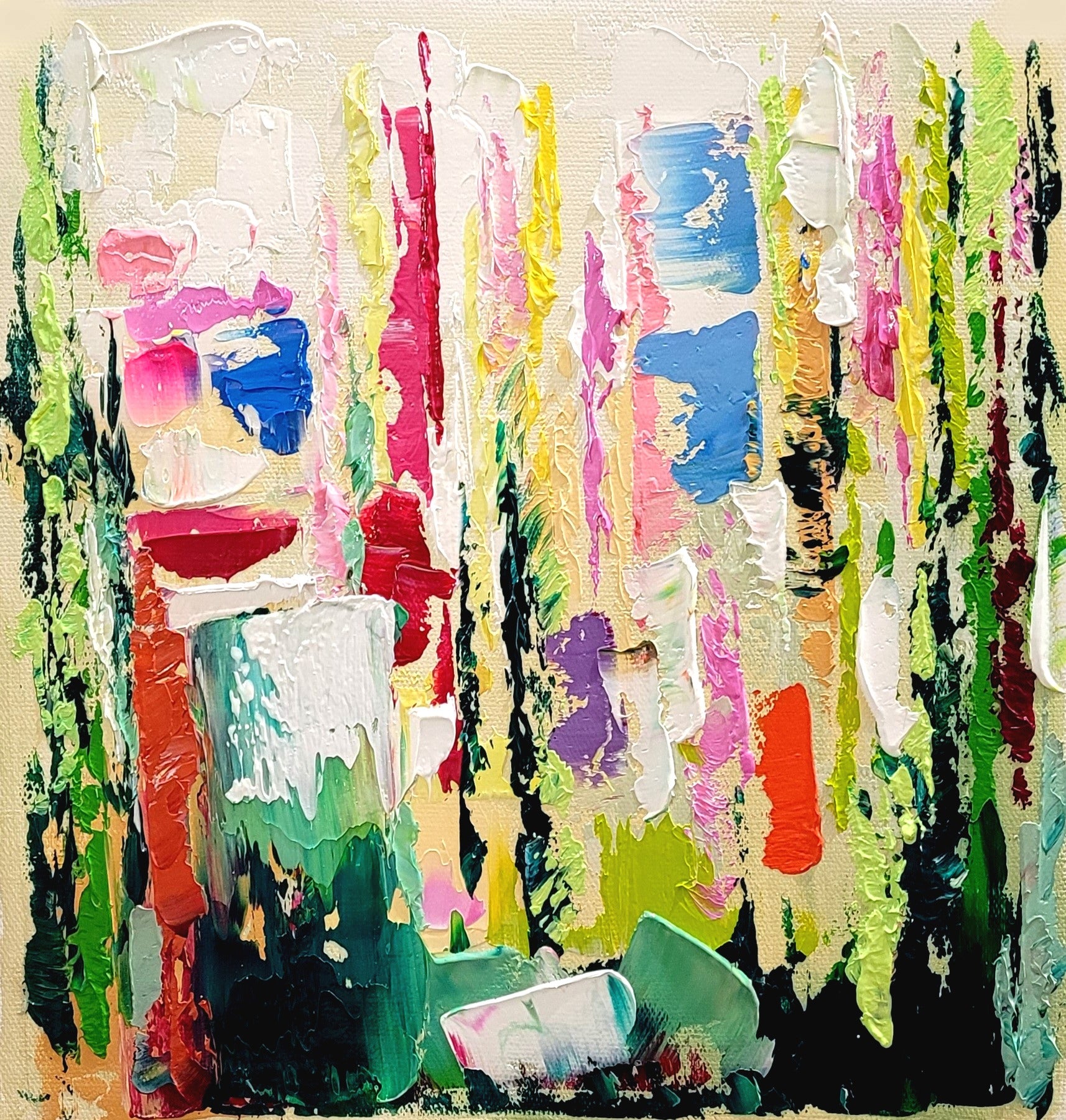 - Bursting with a rich palette of colors, this piece showcases dynamic textures and bold strokes, creating an eye-catching visual experience.