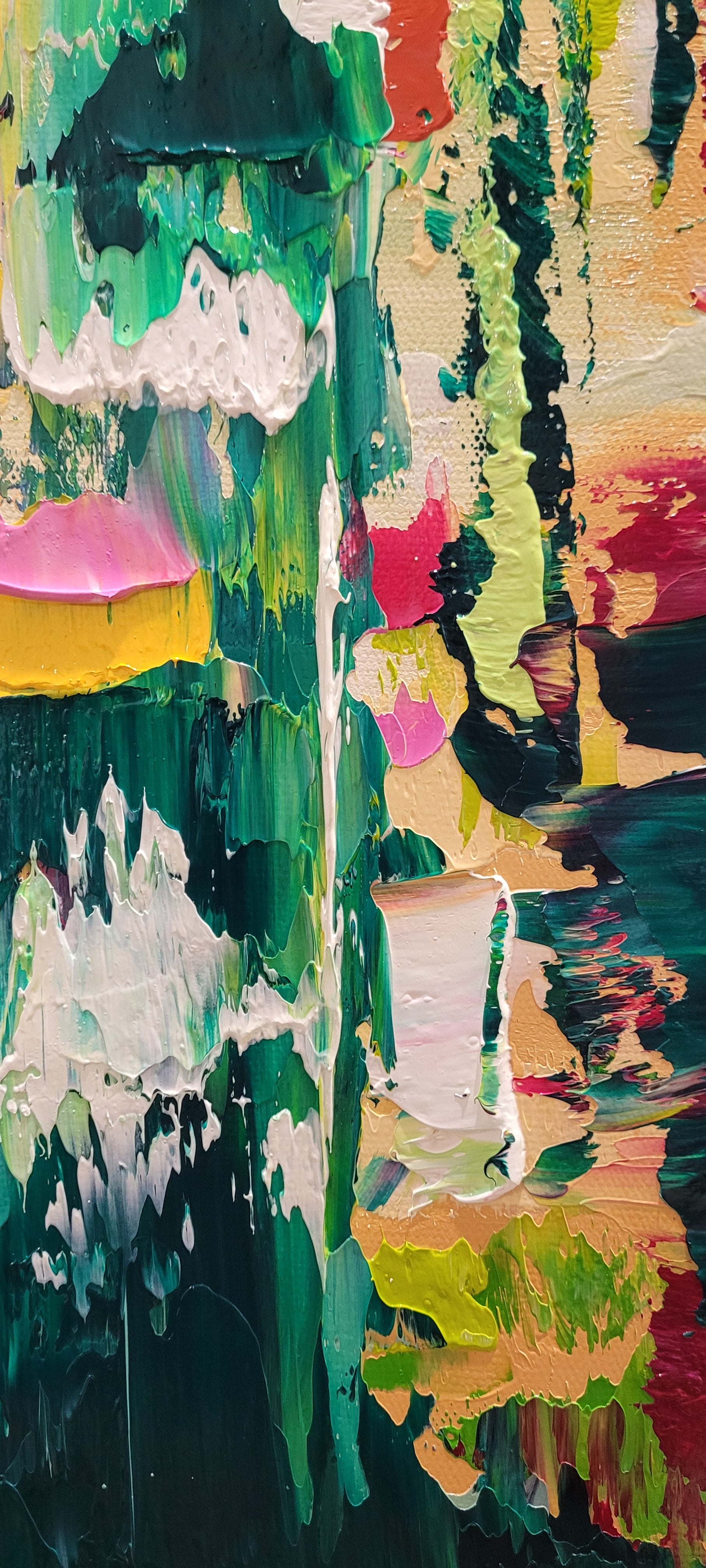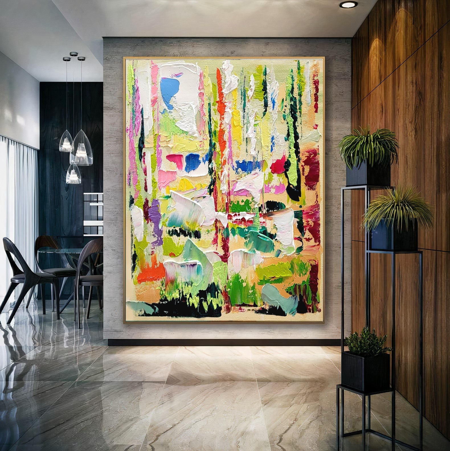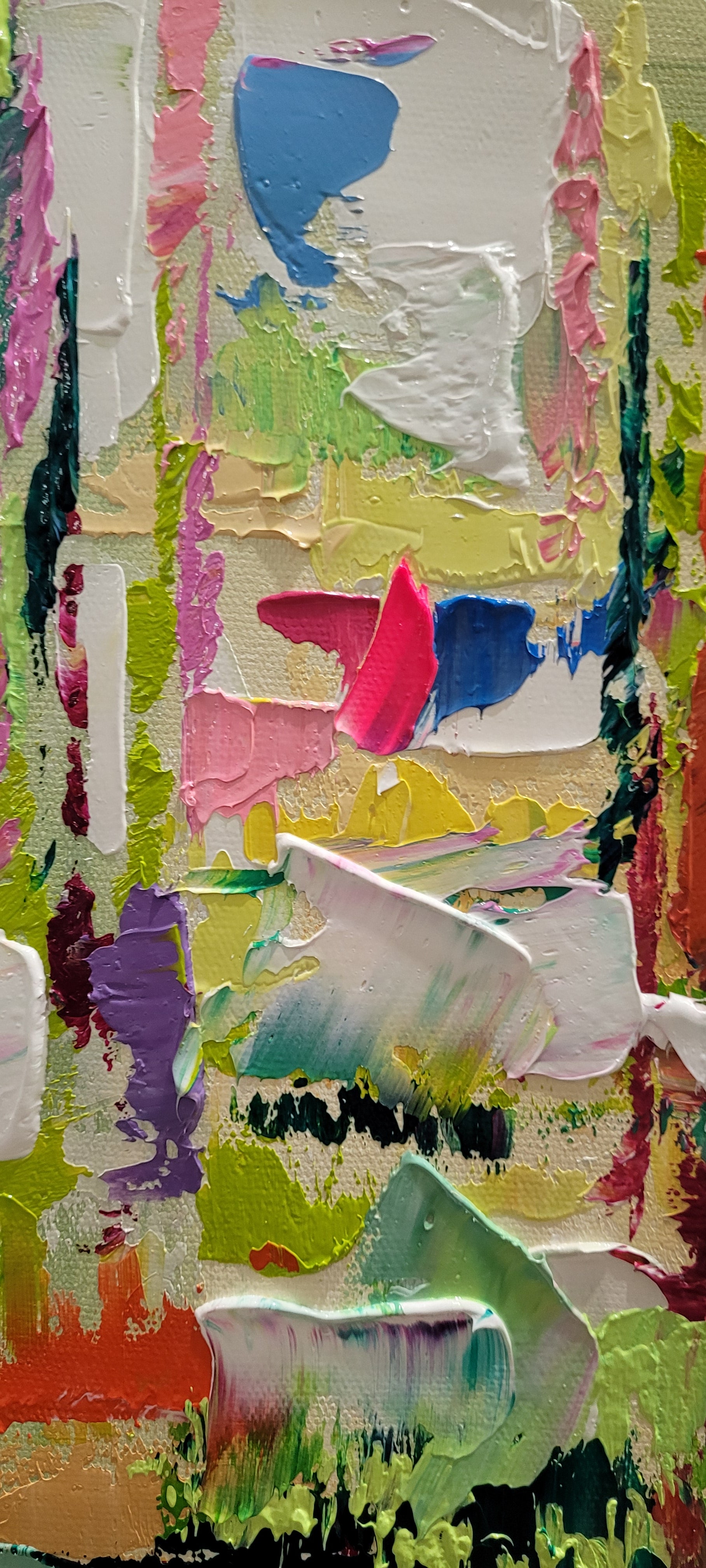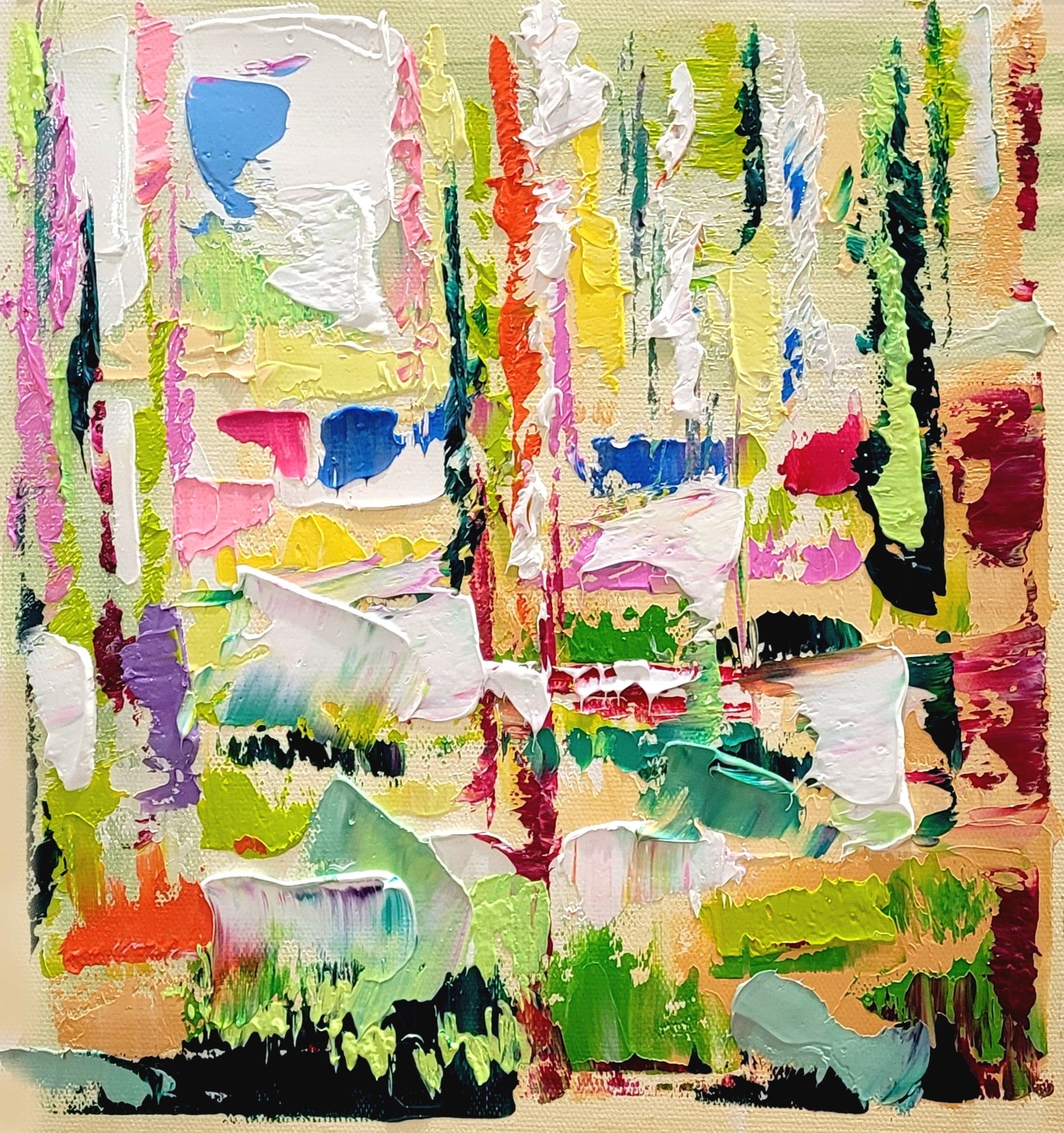 - Bursting with a rich palette of colors, this piece showcases dynamic textures and bold strokes, creating an eye-catching visual experience.