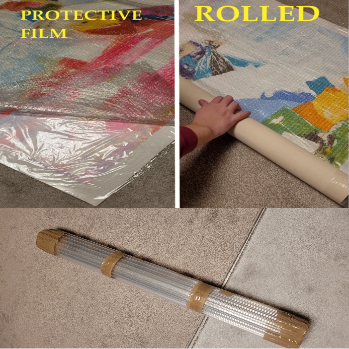 The painting is carefully rolled and wrapped in an anti-shock film with large air strips, providing superior protection against impact during transportation.
