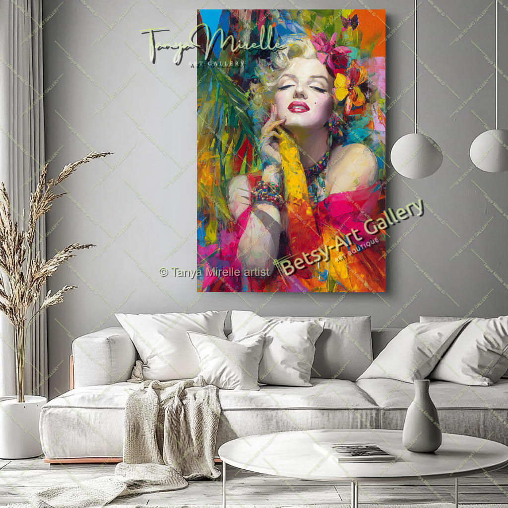 - This vibrant and chic canvas print features a pop art depiction of the timeless Charmant Oriental Marilyn Monroe Portrait - Vibrant Modern Canvas Print, blending classic Hollywood glamour with modern graffiti elements.