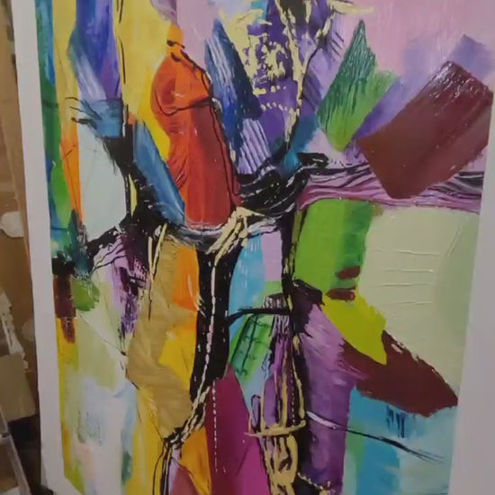 - Bursting with a rich palette of colors, this piece showcases dynamic textures and bold strokes, creating an eye-catching visual experience.