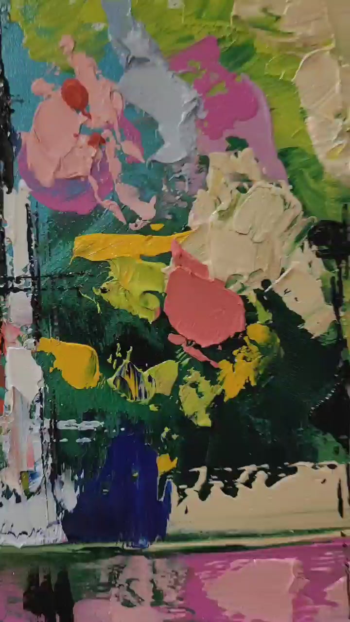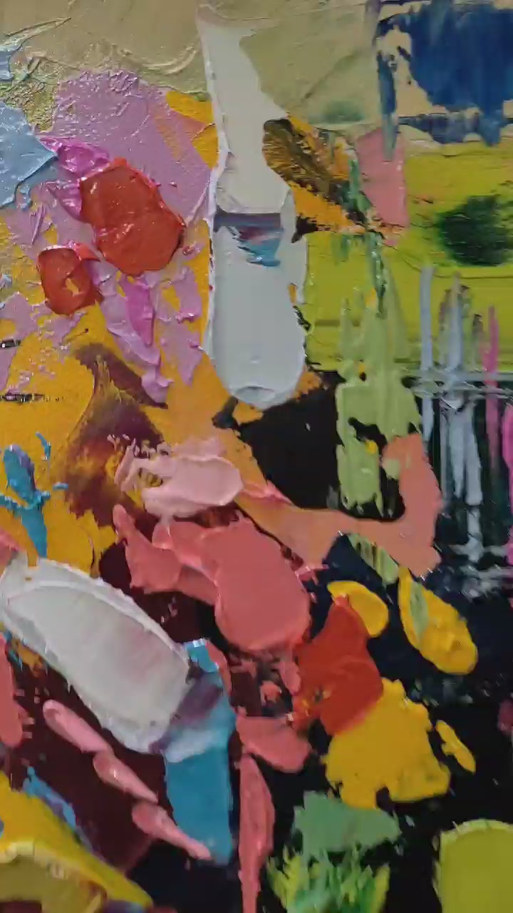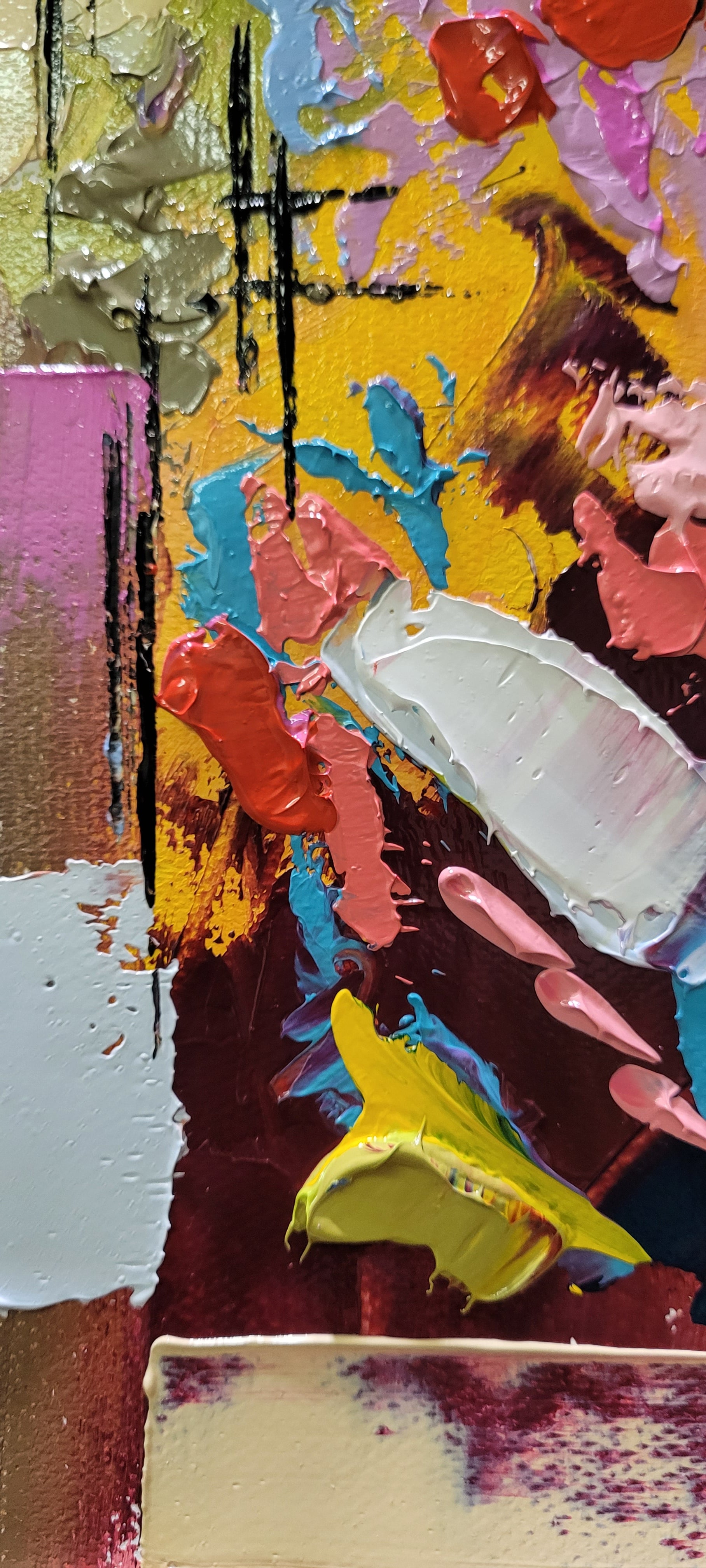 - Bursting with a rich palette of colors, this piece showcases dynamic textures and bold strokes, creating an eye-catching visual experience.