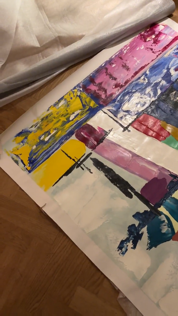 After purchase you will need to wait 4–6 weeks for the painting to dry, as I use thick, voluminous strokes that require ample drying time.