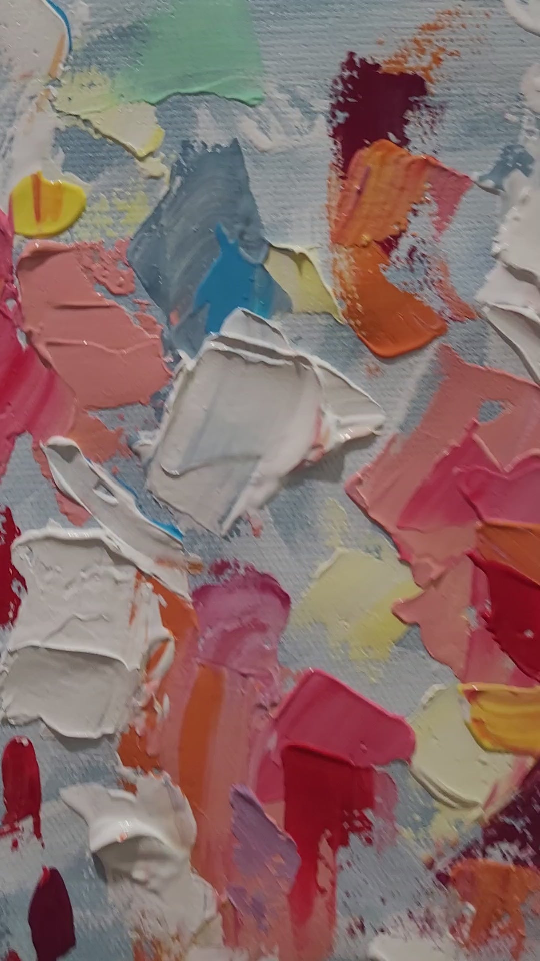 - Bursting with a rich palette of colors, this piece showcases dynamic textures and bold strokes, creating an eye-catching visual experience.