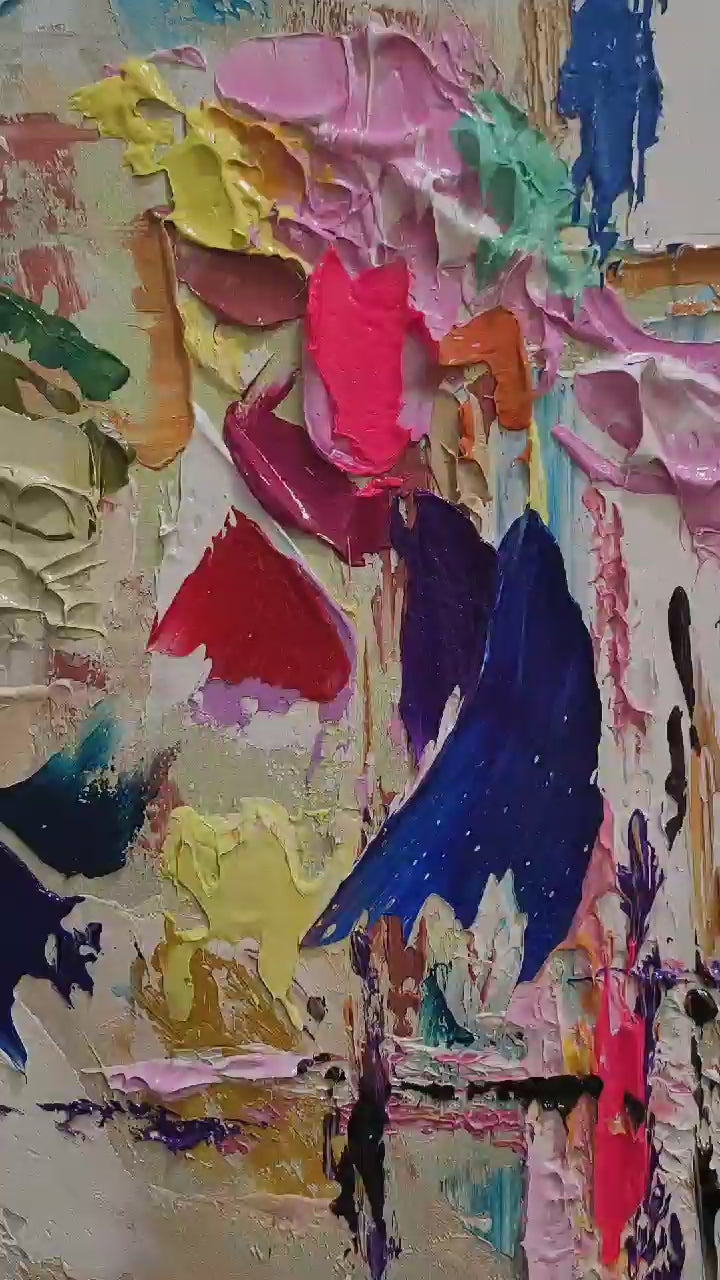 - Bursting with a rich palette of colors, this piece showcases dynamic textures and bold strokes, creating an eye-catching visual experience.