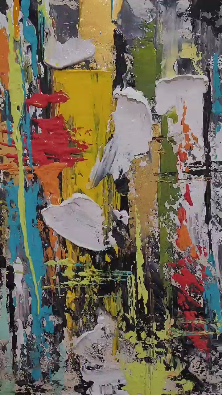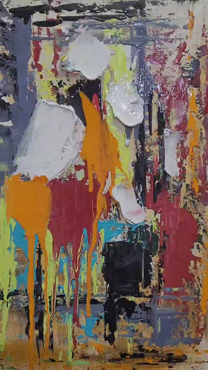 - Bursting with a rich palette of colors, this piece showcases dynamic textures and bold strokes, creating an eye-catching visual experience.